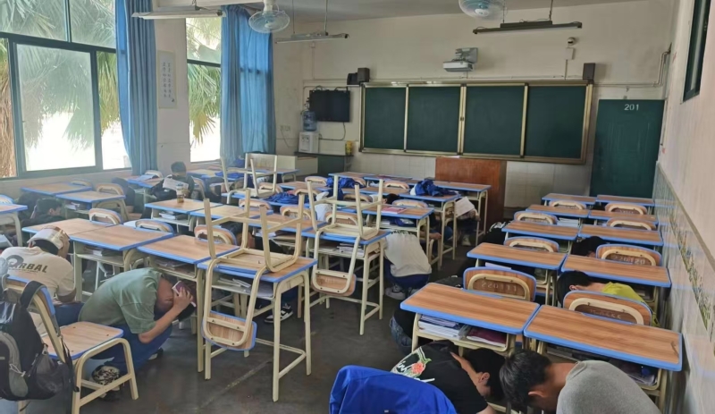 随着第一次警报声的响起,防震演练正式拉开序幕。老师们立即组织学生停止一切活动,以最快的速度引导学生护头,就近躲到墙角、课桌下等“安全三角区”进行紧急避险。