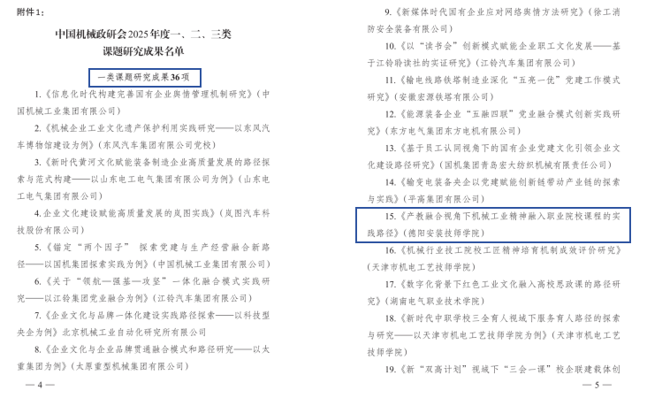 12月29日,中国机械工业职工思想政治工作研究会发布《关于发布 2025 年度一、二、三类课题研究成果和组织推荐课题研究成果突出单位的通知》(机械政研会〔2025〕16 号),学院主持的《产教融合视角下机械工业精神融入职业院校课程的实践路径研究》课题获评一类课题,参与的中国机械工业建设集团有限公司《机械行业施工企业 “党建引领 + 工业文化” 助推高质量发展路径研究》课题获评二类课题,彰显了学院在思想政治工作与职业教育融合研究领域的扎实功底与创新实力。